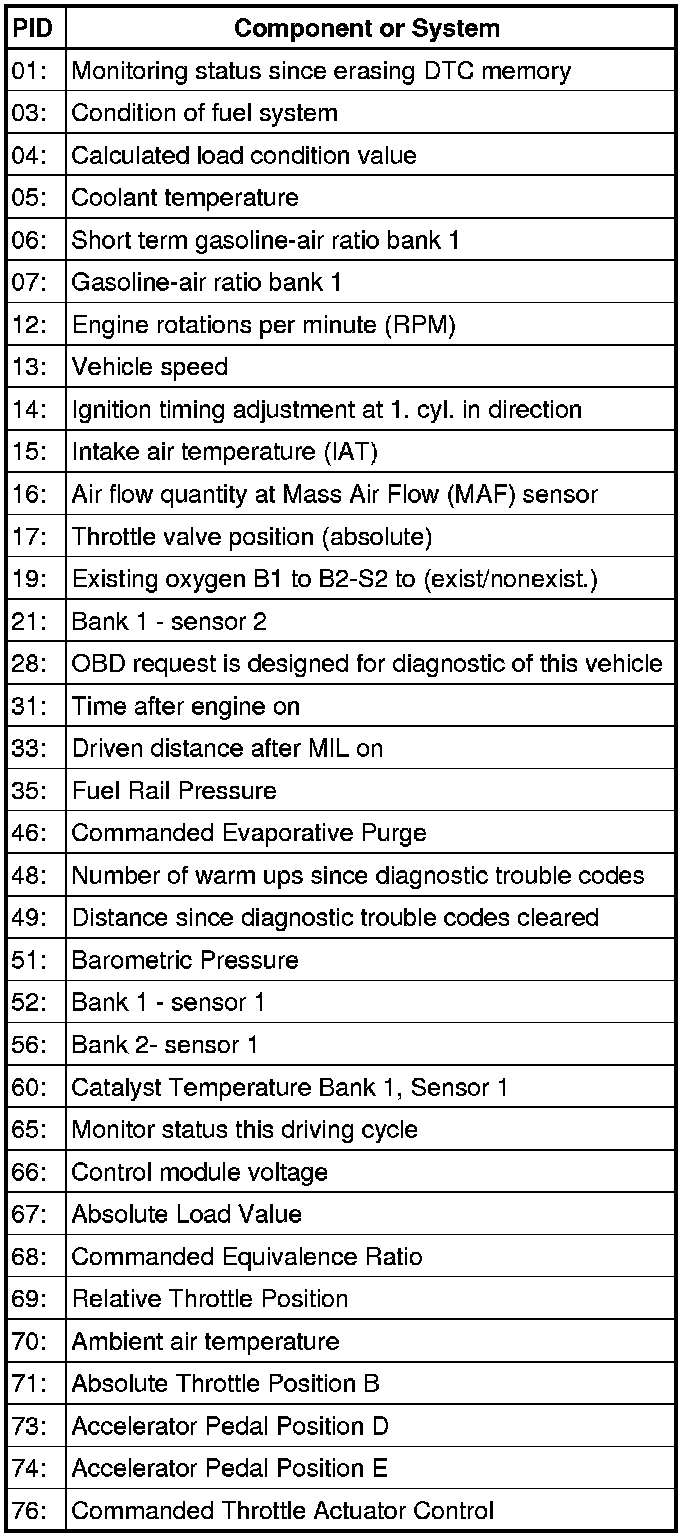 - From the following table, select the desired the "PID" that is to be monitored, e.g. "PID $05 Coolant temperature".