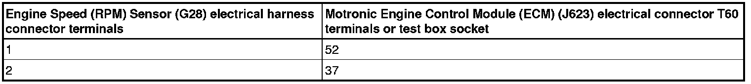 - Using a multimeter, check the Engine Speed (RPM) Sensor (G28) electrical harness connector terminals to the Motronic Engine Control Module (ECM) (J623) electrical harness connector T60 terminals for an open circuit.