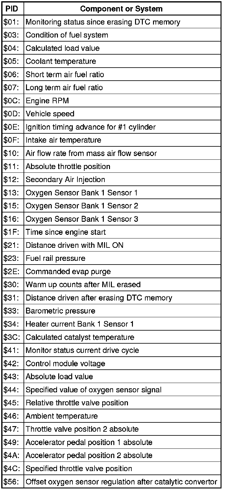 • Depending on scan tool and protocol used, the information in diagnostic mode 01 may be referred to by different names such as Test-ID (TID), Hex-ID, Component-ID (CID), or On-Board Diagnostic Monitor Identifier (OBDMID).