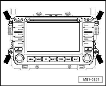 - Remove the screws - arrows - (1.5 Nm) on the radio/navigation display unit control module.