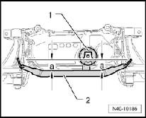 - Align tube T10214/2 on subframe with pressed in bonded rubber bushings. Edges of bonded rubber bushing inner core - 1 - must run on imaginary line parallel to edge of assembly tool T10267 - 2 -.