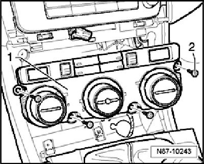 - Remove the screws - 2 - and then remove the A/C control head E87 and the Climatronic control module J255 - 1 - from the instrument panel.