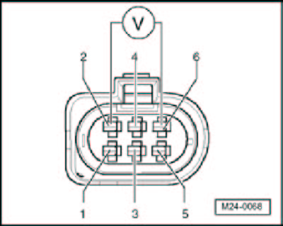- Using a Multimeter, check the Throttle Drive (for Electronic Power Control (EPC)) G187 at the Throttle Valve Control Module J338 electrical harness connector terminals 2 to 6 for voltage.