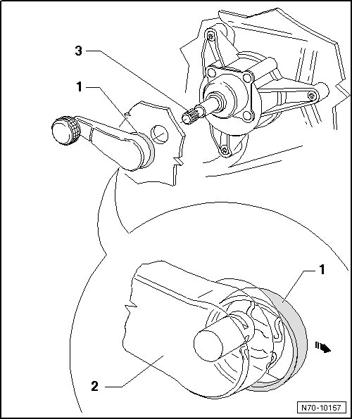 - Press circlip - 1 - back in direction of travel - arrow - and remove window crank - 2 - from drive mechanism - 3 -.
