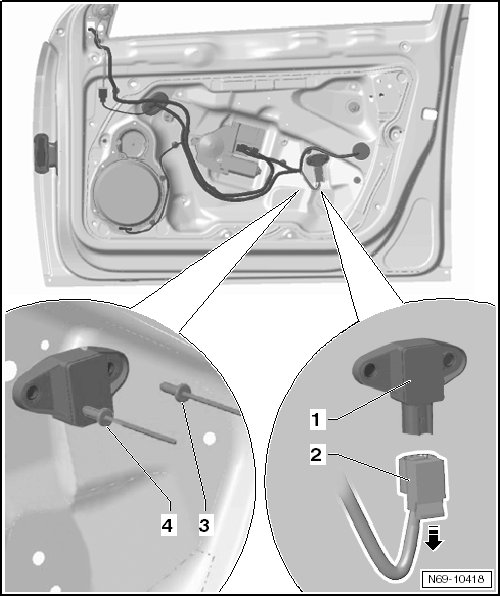 - Press connector lock and remove connector - 4 - from Front Passenger Side Airbag Crash Sensor (G180) - 3 -.