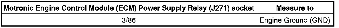 - Check the Motronic Engine Control Module (ECM) Power Supply Relay (J271) socket 3/86 to Battery ( A) positive for an open circuit or short to Ground (GND).