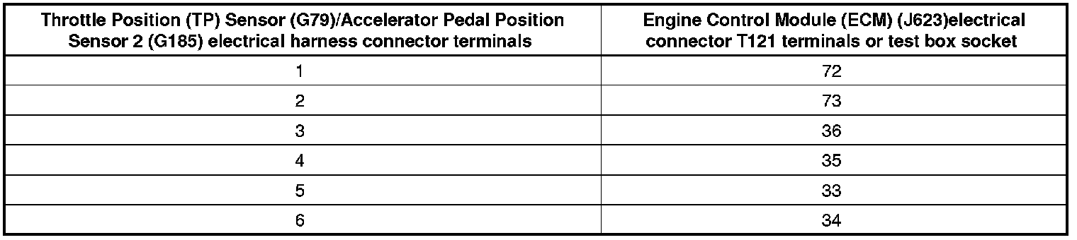 - Using a Multimeter, check the Throttle Position (TP) Sensor (G79)/Accelerator Pedal Position Sensor 2 (G185) electrical harness connector terminals to the Engine Control Module (ECM) (J623) electrical connector T121 for resistance.