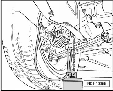 - Connect collector bottle bleeder hose - 1 - to left front bleeder screw, open bleed screw and allow the corresponding quantity to flow out (see table). Close the bleeder screw, torque, refer to=> Suspension, Wheels, Steering 44 Removal and Installation.