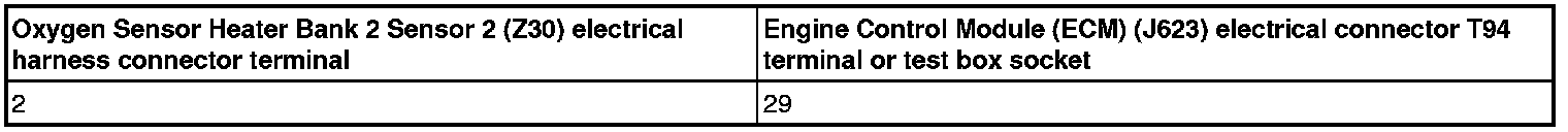 - Using a multimeter, check the Oxygen Sensor Heater Bank 2 Sensor 2 (Z30) electrical harness connector to the Engine Control Module (ECM) (J623) electrical harness connector T94 for an open circuit.