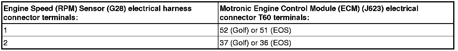 - Using a multimeter, check the Engine Speed (RPM) Sensor (G28) electrical harness connector terminals to the Motronic Engine Control Module (ECM) (J623) electrical harness connector T60 terminals for an open circuit. Refer to the Wiring Diagrams