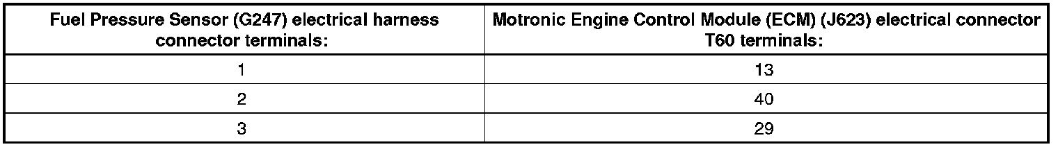 - Using a multimeter, check the Fuel Pressure Sensor (G247) electrical harness connector terminals to the Motronic Engine Control Module (ECM) (J623) electrical harness connector T60 terminals for an open circuit according to the chart below.