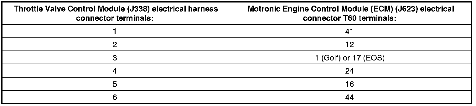 - Using a multimeter, check the Throttle Valve Control Module (J338) electrical harness connector terminals to the Motronic Engine Control Module (ECM) (J623) electrical harness connector T60 terminals for an open circuit. Refer to Wiring Diagrams.