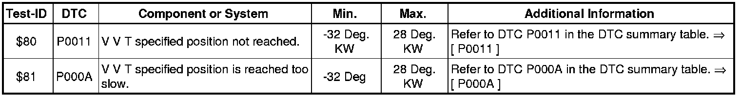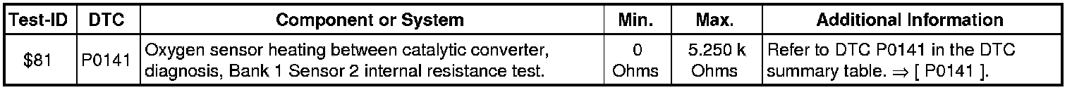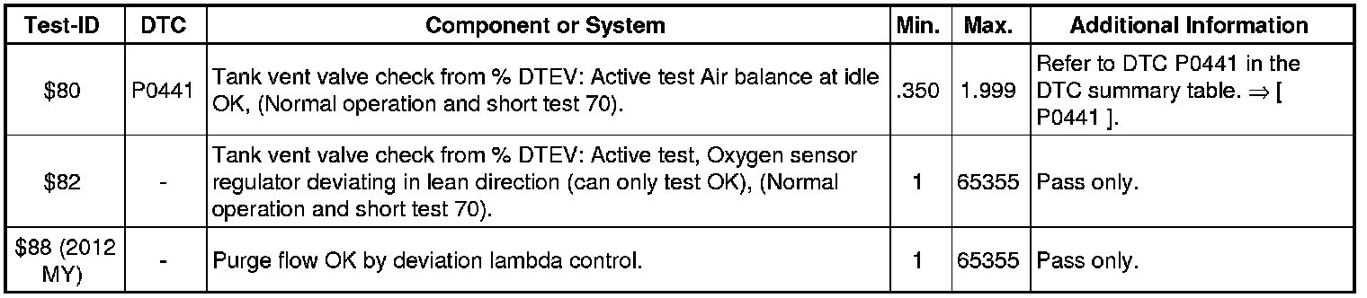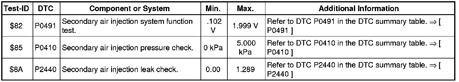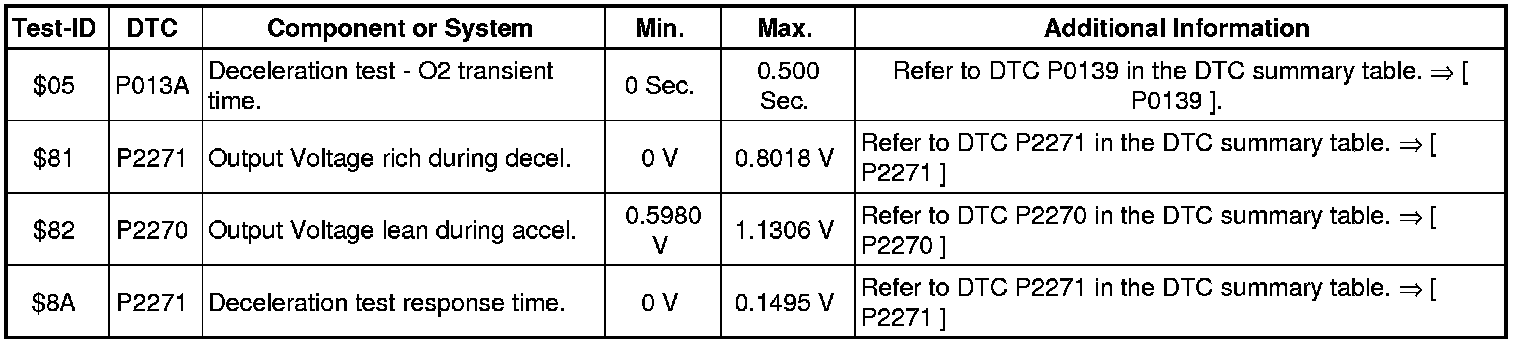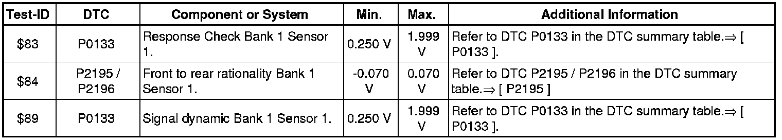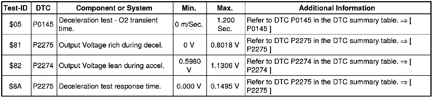 - If any of components or systems fail to meet the specified values. Refer to Diagnostic "Mode 03: Interrogating Fault Memory" to check for stored DTC's or the corresponding diagnostic repair procedure => [ Diagnostic Mode 03 - Read DTC Memory ].