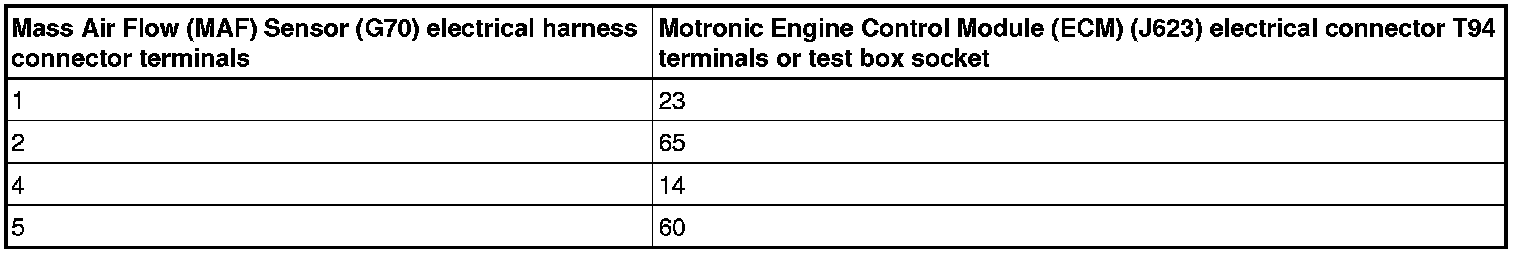 - Using a multimeter, check the Mass Air Flow (MAF) Sensor (G70) electrical harness connector terminals to the Motronic Engine Control Module (ECM) (J623) electrical harness connector T94 terminals for an open circuit.