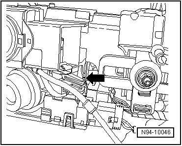 - On the steering column electronics control module, slide a wire or a 2.5 mm drill - 2 - approximately 45 mm into hole - arrow 1 -, whereby the retaining detent is released - arrow 2 -.