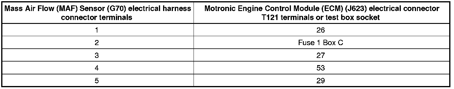 - Using a multimeter, check the Mass Air Flow (MAF) Sensor (G70) electrical harness connector terminals to the Motronic Engine Control Module (ECM) (J623) electrical harness connector T121 terminals for an open circuit.