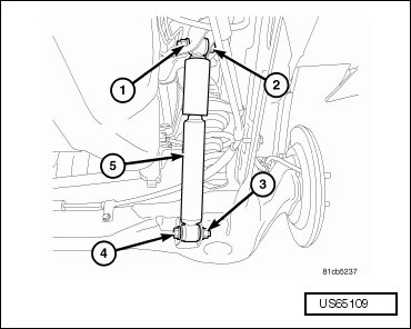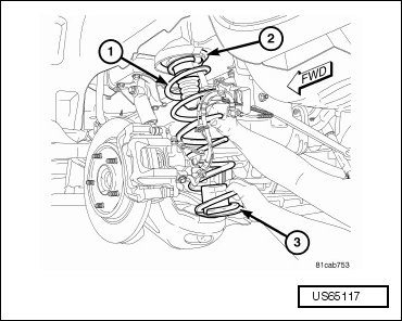 - Remove both coil springs (1), jounce bumpers (2) and lower isolators (3).