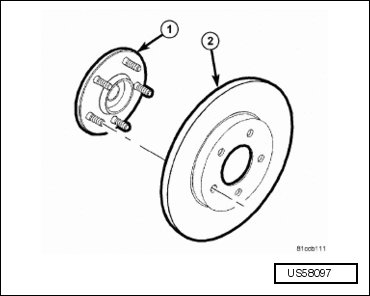 - Remove any retaining clips, then slide brake rotor (2) off hub and bearing (1).