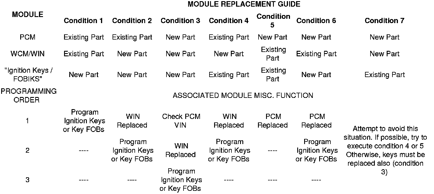 Match the module row with the condition that applies, after module replacement follow the chart down and program the modules in the chart order.