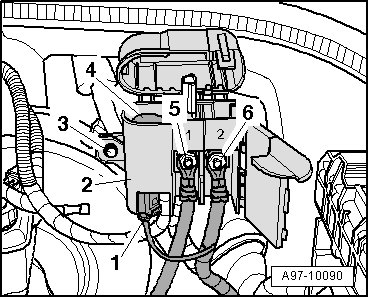 - Remove the bolt - 3 - (9 Nm) and the positive terminal pick-up - 2 - from the retainer with the suppressor.