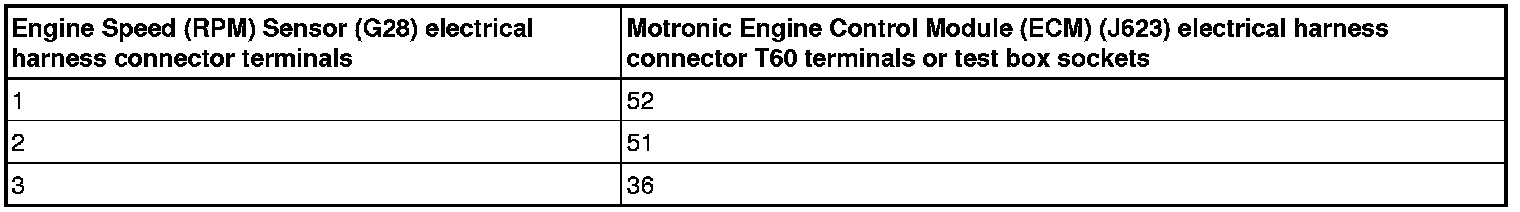 - Using a multimeter, check the Engine Speed (RPM) Sensor (G28) electrical harness connector terminals to the Motronic Engine Control Module (ECM) (J623) electrical harness connector T60 terminals for resistance.