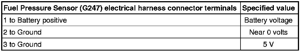 - Using a multimeter, check the Fuel Pressure Sensor (G247) electrical harness connector - 1 - terminals for voltage.