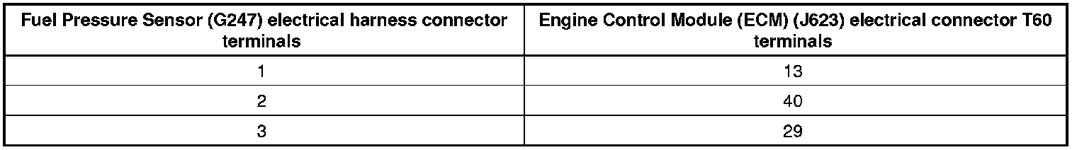 - Using a multimeter, check the Fuel Pressure Sensor (G247) harness connector terminals to the Engine Control Module (ECM) (J623) harness connector for an open circuit according to the chart below.