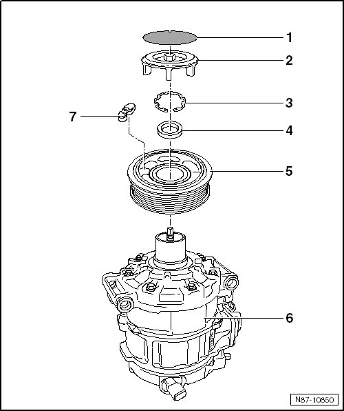 • Different versions of the ribbed belt pulley may be installed, depending on A/C compressor construction type and engine version. Refer to Electronic Parts Catalog (ETKA).