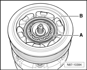 - Position the drive plate- C - between the rubber elements until they touch the A/C compressor shaft - B -.