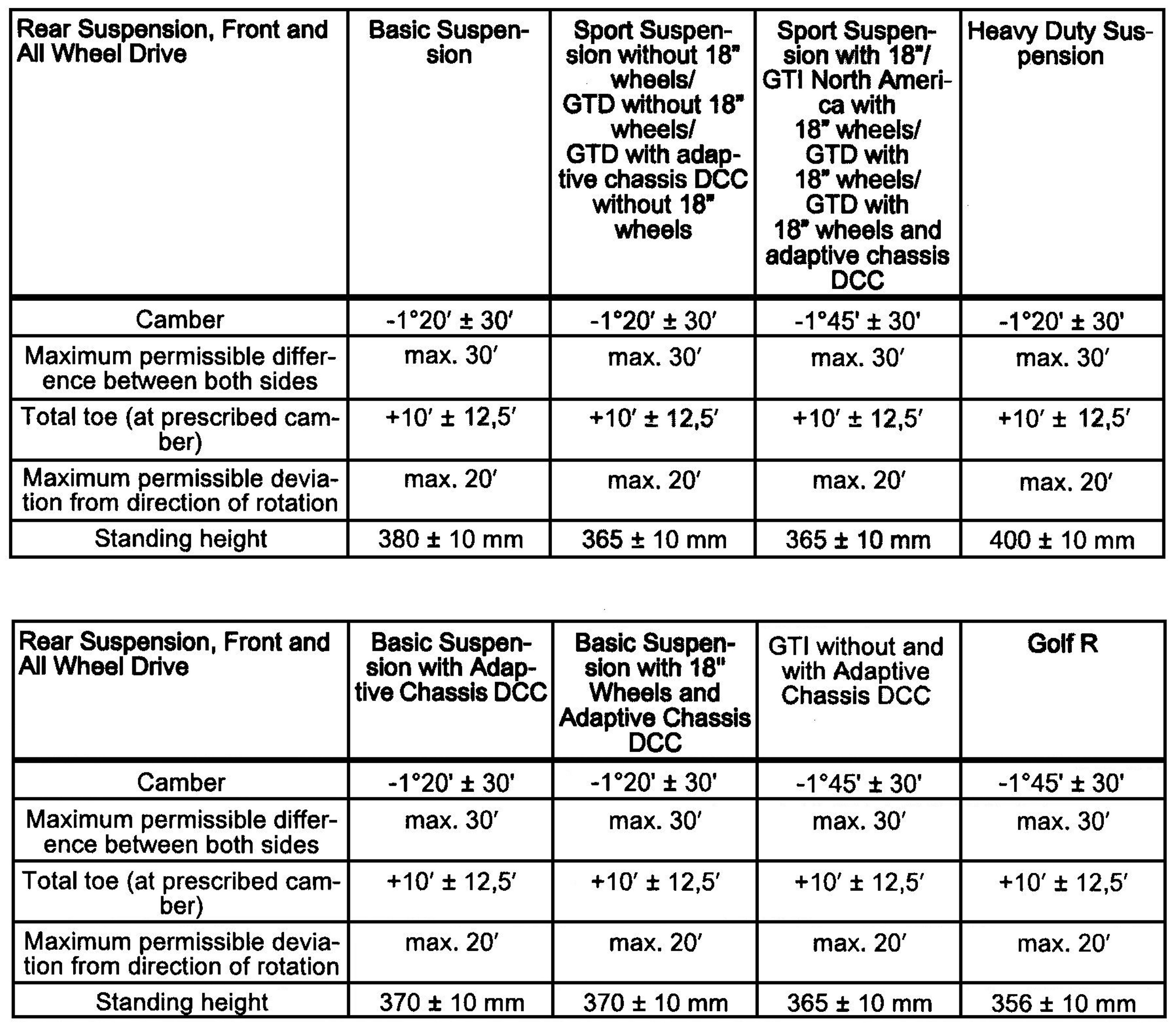 Standing heights listed in the tables refer to dimension - a -