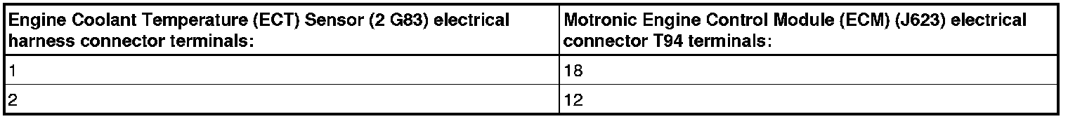 - Using a multimeter, check the Engine Coolant Temperature (ECT) Sensor (G62 or G83) electrical harness connector terminal 1 to the Motronic Engine Control Module (ECM) (J623) electrical harness connector for an open circuit or a short to voltage, refer to the chart below for the appropriate sensor. Refer to Wiring Diagrams for pin locations.