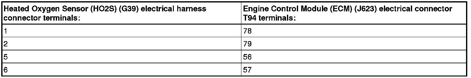 - Using a multimeter, check the Heated Oxygen Sensor (HO2S) (G39) electrical harness connector terminals to the Engine Control Module (ECM) (J623) electrical harness connector T94 terminals for an open circuit. Refer to Wiring Diagrams for pin locations.