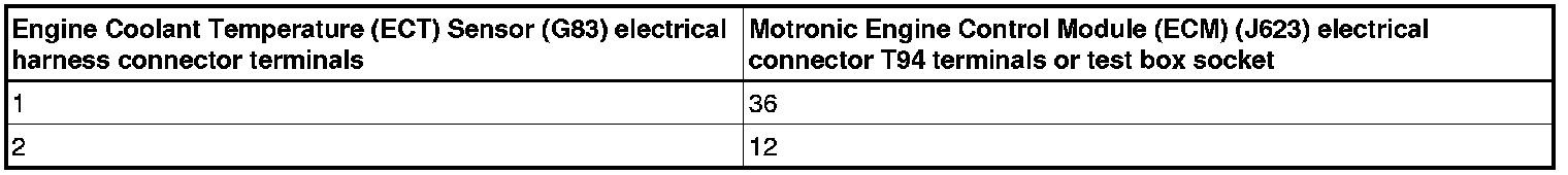 - Using a multimeter, check the the Engine Coolant Temperature (ECT) Sensor (G62 or 83) electrical harness connector terminals to the Motronic Engine Control Module (ECM) (J623) electrical harness connector T60 terminals for an open circuit or a short to voltage, refer to the chart below.