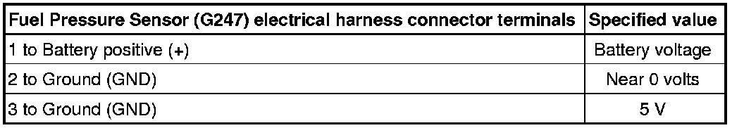 - Using a multimeter, check the Fuel Pressure Sensor (G247) electrical harness connector - 1 - terminals for voltage.