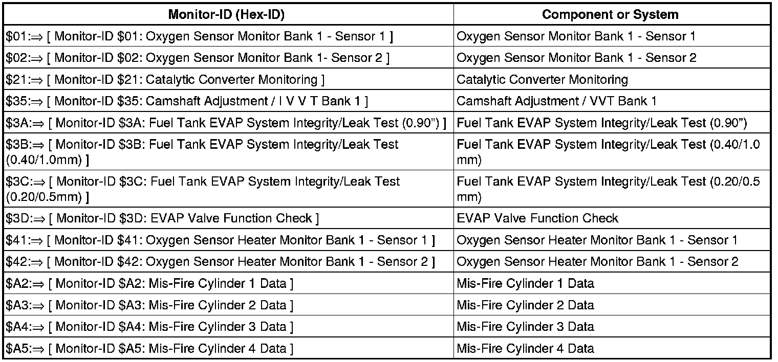 • Depending on scan tool and protocol used, the information in diagnostic mode 01 may be referred to by different names such as Test-ID (TID), Hex-ID, Component-ID (CID), or On-Board Diagnostic Monitor Identifier (OBDMID).