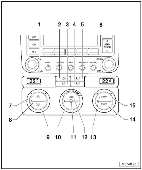 By pressing the AUTO button, Climatronic maintains the selected vehicle interior temperature completely automatically. With this setting the vent air temperature, the blower speed and the air distribution are controlled automatically.