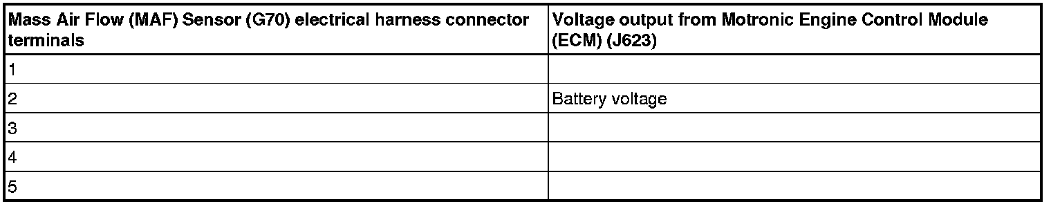 - Using a multimeter, check the Mass Air Flow (MAF) Sensor (G70) electrical harness connector terminals to the Motronic Engine Control Module (ECM) (J623) electrical harness connector T121 terminals for an open circuit.