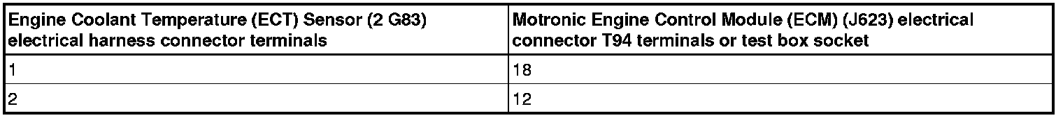 - Using a multimeter, check the Engine Coolant Temperature (ECT) Sensor (G62 or G83) electrical harness connector terminal 1 to the Motronic Engine Control Module (ECM) (J623) electrical harness connector for an open circuit or a short to voltage, refer to the chart below for the appropriate sensor. Refer to Wiring Diagrams for pin locations.