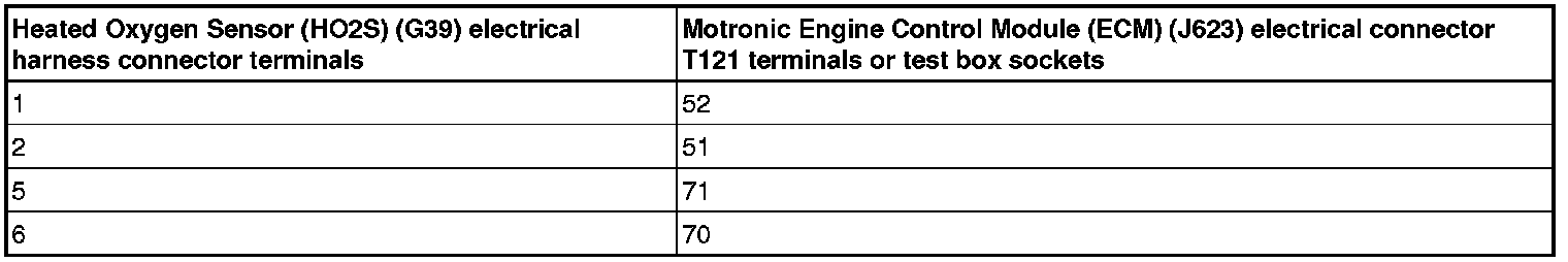 - Using a multimeter, check the Heated Oxygen Sensor (HO2S) (G39) electrical harness connector terminals to the Motronic Engine Control Module (ECM) (J623) electrical harness connector T121 terminals for an open circuit.