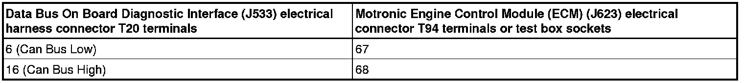 - Using a multimeter, check the Data Bus On Board Diagnostic Interface (J533) electrical harness connector T20 to the Motronic Engine Control Module (ECM) (J623) electrical harness connector T94 for resistance.
