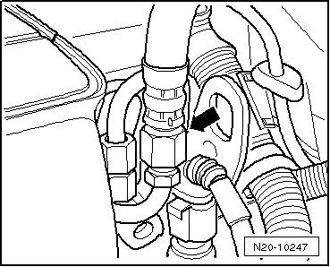 - Place a cloth around connection and slowly loosen union nut - arrow - to reduce fuel pressure.