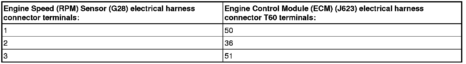 - Using a multimeter, check the Engine Speed (RPM) Sensor (G28) electrical harness connector terminals to the Engine Control Module (ECM) (J623) electrical harness connector T60 terminals for resistance.