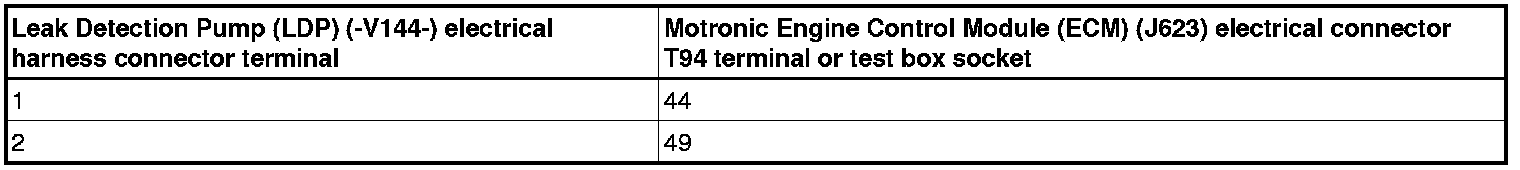 - Using a multimeter, check the Leak Detection Pump (LDP) (-V144-) electrical connector terminals to Motronic Engine Control Module (ECM) (J623) electrical connector terminals for an open circuit or high resistance.