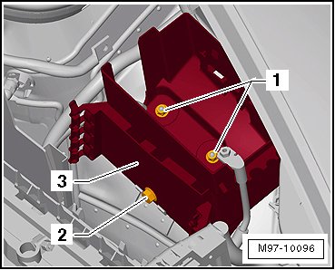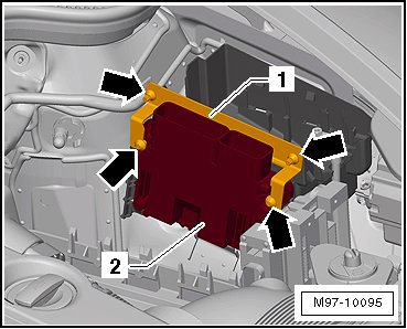 - Remove the engine control module - 2 - and bracket - 1 - off the E-box. To do this, first remove the shear bolts - arrows -.