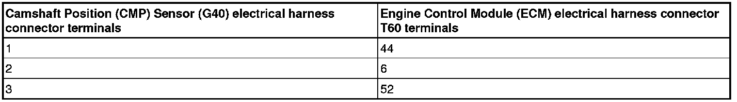 - Using a multimeter, Check the Camshaft Position (CMP) Sensor (G40) electrical harness connector to the Engine Control Module (ECM) electrical harness connector T60 for an open circuit. Refer to Wiring Diagrams for pin locations.