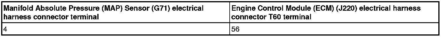 - Using a multimeter, check the Manifold Absolute Pressure (MAP) Sensor (G71) electrical harness connector terminal 4 to the Engine Control Module (ECM) (J220) electrical harness connector T60 terminal 56 for resistance. Refer to Wiring Diagrams for pin locations.