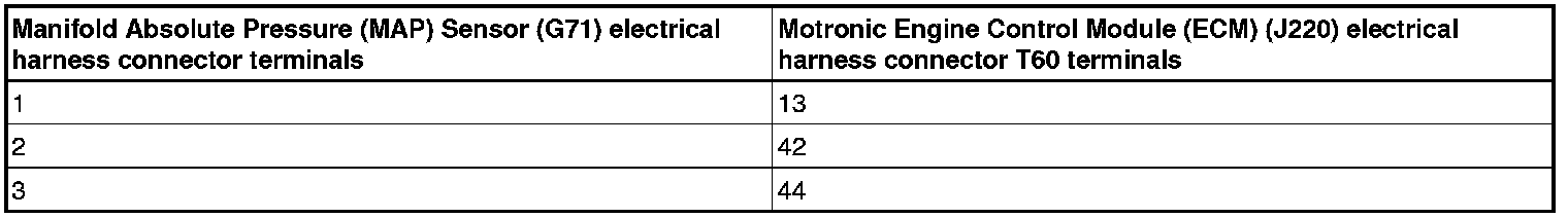 - Using a multimeter, check the Manifold Absolute Pressure (MAP) Sensor (G71) electrical harness connector terminals to the Motronic Engine Control Module (ECM) (J220) electrical harness connector T60 terminals for resistance. Refer to Wiring Diagrams for pin locations.