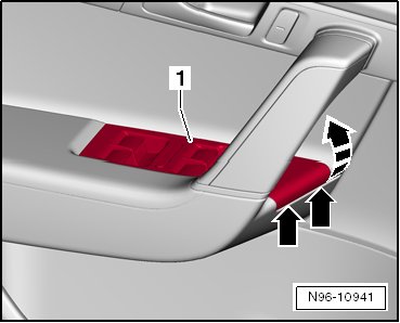 - Release the tabs - arrows - and remove the button module - 1 - from the handle trim.