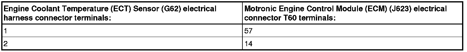 - Using a multimeter, check the the Engine Coolant Temperature (ECT) Sensor (G62 or 83) electrical harness connector terminals to the Motronic Engine Control Module (ECM) (J623) electrical harness connector T60 terminals for an open circuit or a short to voltage, refer to the chart below.