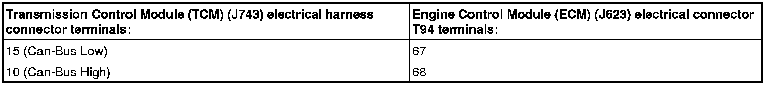 - Using a multimeter, check the Transmission Control Module (TCM) (J743) electrical harness connector to the Engine Control Module (ECM) (J623) electrical harness connector T94 for resistance.